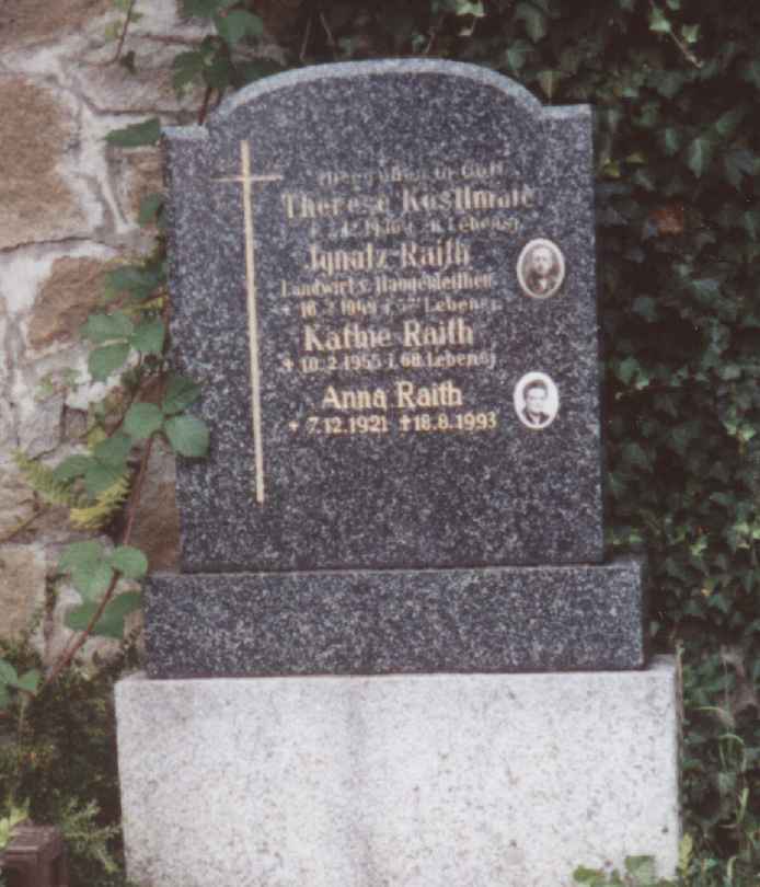Das an der nördlichen Mauer des größeren Friedhofs in Kirchberg befindliche Grab von Köstlmaier und Raith ist u. a. die Ruhestätte von Therese und Kathie. Therese war die Mutter meiner Uroma Maria Schiller, geb. Köstlmaier (siehe oberste Grabbeschreibung). Therese, geb. Stadler, verstarb am 07. 12. 1936 in Hangenleithen. Kathie Raith war meines Wissens nach ein weiteres Kind der Therese. Kathie heiratete den ebenfalls hier begrabenen Ignaz Raith. Anna Raith war die Ehefrau von Ignatz Raith junior, einem Adoptivsohn des hier begrabenen Ignatz Raith senior.