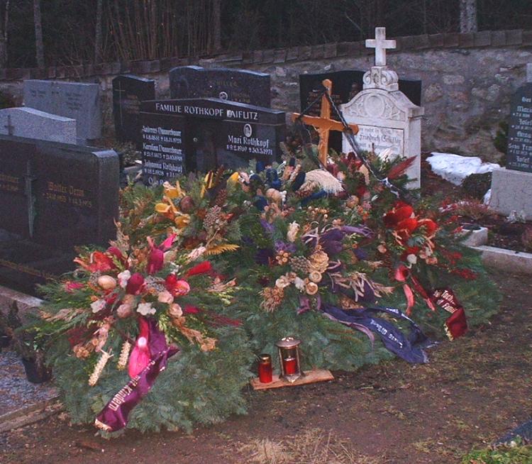 Auch meine Ende 2001 verstorbene Oma Maria fand hier inzwischen ihre letzte Ruhestätte. Die obige Abbildung zeigt das noch geschmückte Grab. Die Aufnahme stammt vom 6. Februar 2002. |