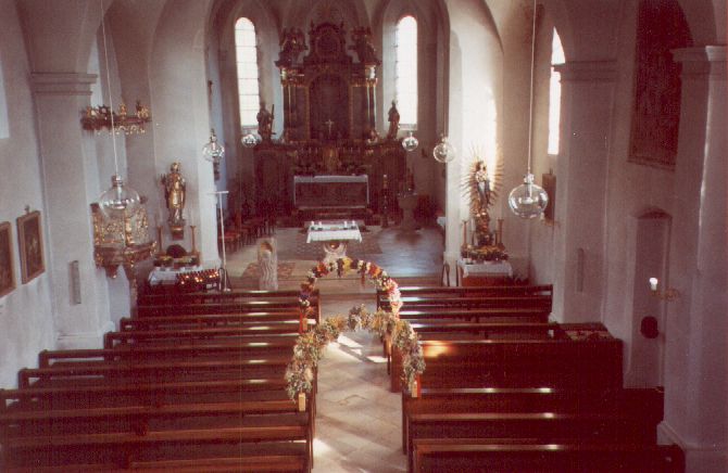 Die Pfarrkirche von Kirchberg im Wald. | Hier sehen Sie Südseite des Kirchturms - früher gehörte er noch zu einer Burg die um das Jahr 1000 errichtet wurde. | Blick in den (zum Erntedankfest) geschmückten Kircheninnenraum in Richtung Altar. |